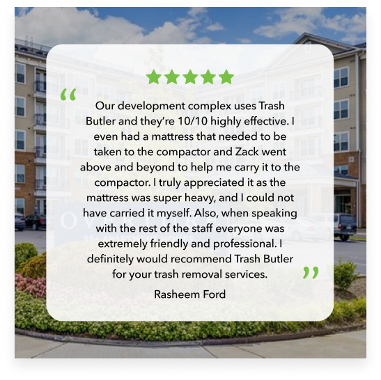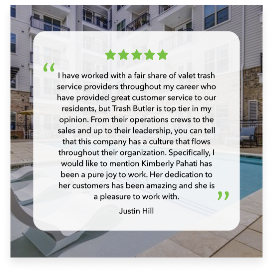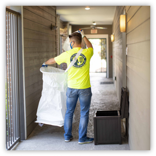 Our clean cut, uniformed Trash Butlers will maintain the cleanliness of your community while picking up bagged trash and recyclables 5-7 nights per week from your residents doorstep.